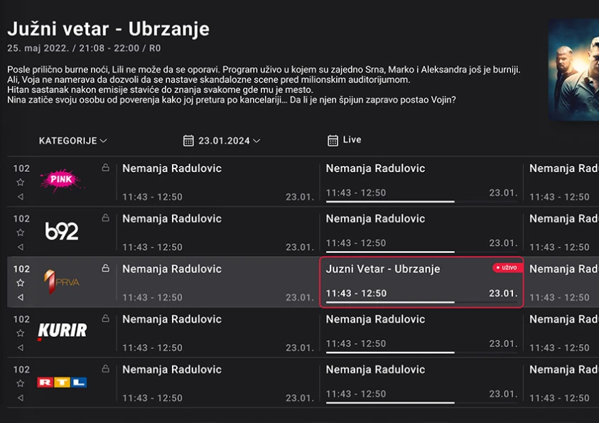 MOVE ti preporučuje najzanimljivije emisije i filmove koji su upravo emitovani. Unapređena pretraga ti omogućava da pronađeš emisiju, film ili seriju putem naslova ili glumca. Nikada ne propusti ništa važno.